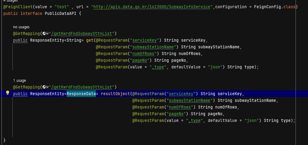 FeignClient를 작성하는데 해당 주소는 공공데이터 포털 Open API 주소이다 .각 쿼리스트링으로 완성되어 요청이 들어간다. 컨트롤러 메소드와 작성 방식이 비슷하다.