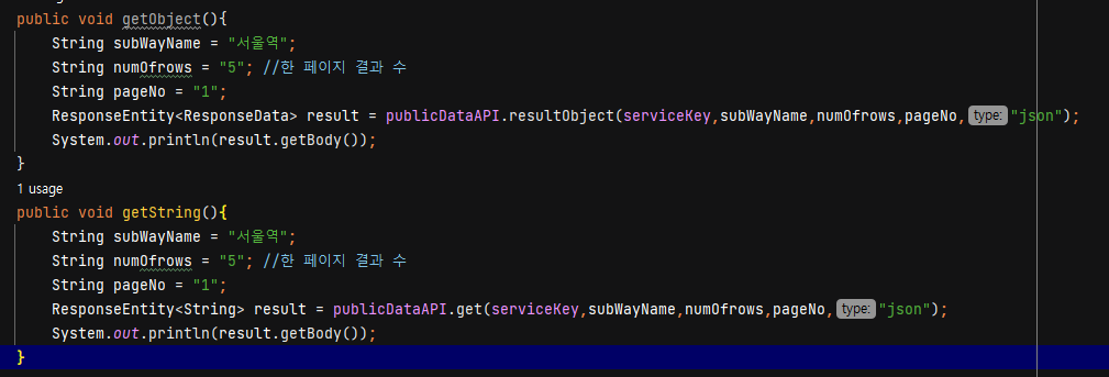 코드는 공공데이터포털에 데이터에 요청을 넣어 데이터를 json 데이터로 바인딩하는 것과 String으로 뽑는 두 개에 메소드를 만들었다.