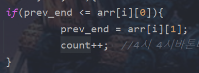 if(prev_end <= arr[i][0]){ //한 회의실에서 몇개나 할 ㅅ 있는지